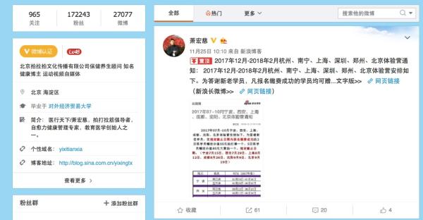 其置頂微博直截了當地為收費的拍打療法體驗營宣傳,內容為2017年12月-2018年2月南寧、上海、深圳、鄭州、北京體驗營的時間安排。