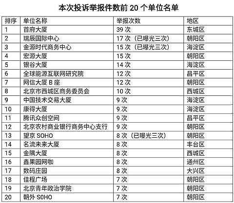 20家投訴高發(fā)單位依然集中在城區(qū),朝陽(yáng)、海淀兩區(qū)被投訴的比例和次數(shù)最多,海淀區(qū)被曝光的4家投訴高發(fā)單位比上次的8家減少一半,朝陽(yáng)區(qū)則比上個(gè)次曝光又增加2家;東城區(qū)除了被投訴最多位于榜首的首府大廈,上次被曝光的其余3家單位沒(méi)有再次上榜;城六區(qū)中,石景山區(qū)依然保持沒(méi)有單位上榜的好勢(shì)頭;豐臺(tái)、昌平、大興都各有1-2家單位首次被曝光。