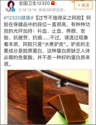 這條《過年不值得買之阿膠》的微博稱,阿膠在保健品中的段位一直很高,有種種功效的光環加持:補血、止血、養顏、安胎、抗疲勞、抗癌……不過,請透過現象看本質,阿膠只是“水煮驢皮”。驢皮的主要成分是膠原蛋白,而這種蛋白質缺乏人體必需的色氨酸,并不是一種好的蛋白質來源。