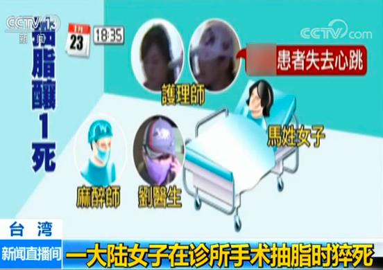 23日,一名大陸女子在臺灣知名醫療美容診所進行抽脂手術時猝死,警方已將醫師和麻醉師等相關責任人移送檢方偵辦。