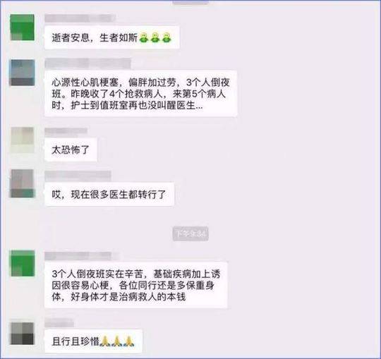 得知此消息,有醫(yī)生在微信群里感嘆,“3個(gè)人倒夜班實(shí)在辛苦,基礎(chǔ)疾病加上誘因很容易心梗,各位同行還是多保重身體。”
