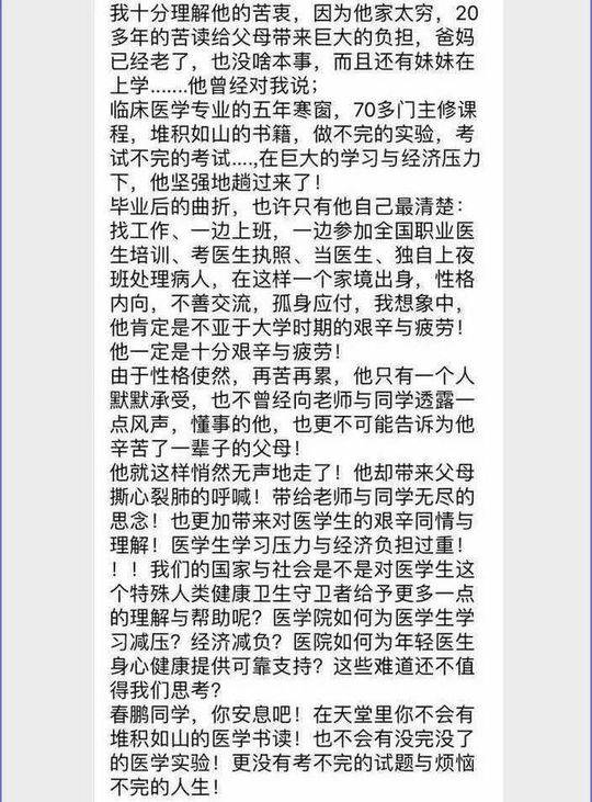 該教師回憶,周春鵬來自內(nèi)蒙古赤峰一個(gè)貧窮家庭,一家5口,他是唯一的兒子。周春鵬從小十分懂事,性格內(nèi)向,不善言表。2005年,他以一本的成績(jī)考入武科大,成為一名醫(yī)學(xué)生。大學(xué)5年,他并不是那么耀眼的學(xué)生,勤奮而低調(diào)。畢業(yè)時(shí),絕大多數(shù)同學(xué)選擇考研,而他卻選擇就業(yè),先養(yǎng)活自己,不再增加爸媽的負(fù)擔(dān)。 工作后,他一邊上班,一邊參加全國(guó)職業(yè)醫(yī)生培訓(xùn)、考醫(yī)生執(zhí)照,獨(dú)自上夜班處理病人。