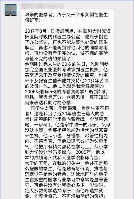 長(zhǎng)江網(wǎng)訊(記者黃瑩)漢陽醫(yī)院年僅30歲的醫(yī)生在值夜班時(shí)猝死。近兩天,武漢科技大學(xué)醫(yī)學(xué)院一名教師寫下的一篇追憶文章在網(wǎng)上盛傳。 據(jù)該教師所寫的微信,出事的醫(yī)生是武科大附屬漢陽醫(yī)院呼吸內(nèi)科醫(yī)生周春鵬,是他曾帶過的2005級(jí)臨床五班的畢業(yè)生。11日凌晨?jī)牲c(diǎn),正在值夜班的他倒在了醫(yī)生值班室的辦公桌上。他當(dāng)晚收了4個(gè)搶救病人,來第5個(gè)病人時(shí),護(hù)士到值班室再也沒叫醒他。死因是心源性心肌梗塞,偏胖加過勞。科室安排的是3個(gè)人倒夜班。
