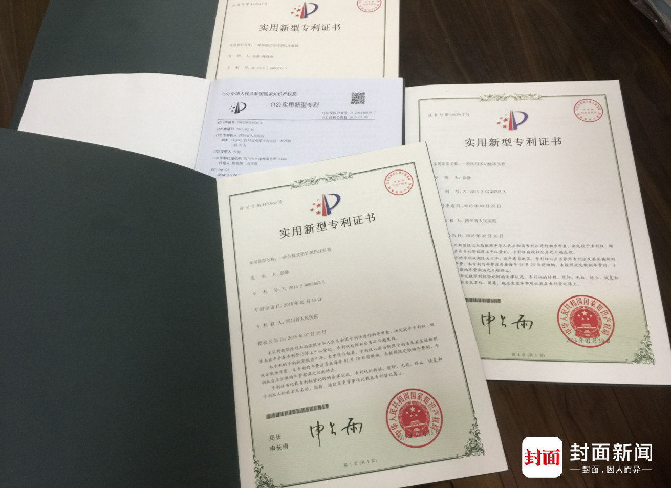 張靜說,從開始有想法到設計草圖,最短只需要一周的時間。但從申請專利到臨床使用等,往往需要至少一年的時間。“胃管申報時間最最快,用了一年,已經有部分醫院在試用。”張靜拿出了平日堆放在柜子里的一大疊專利證書說,今年還有十余項專利,已通過認證,很快就能收到證書了。