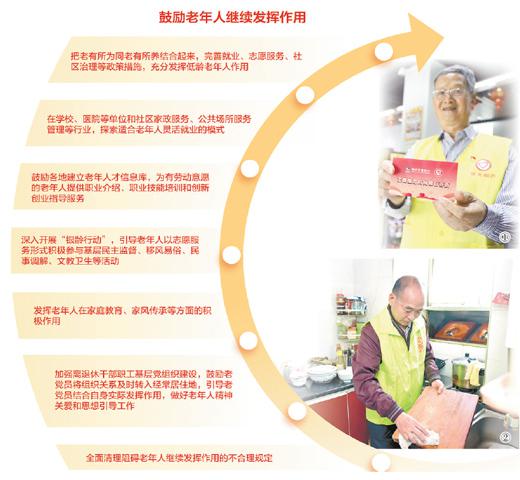 《中共中央國務院關于加強新時代老齡工作的意見》指出,鼓勵老年人繼續發揮作用。把老有所為同老有所養結合起來,完善就業、志愿服務、社區治理等政策措施,充分發揮低齡老年人作用。