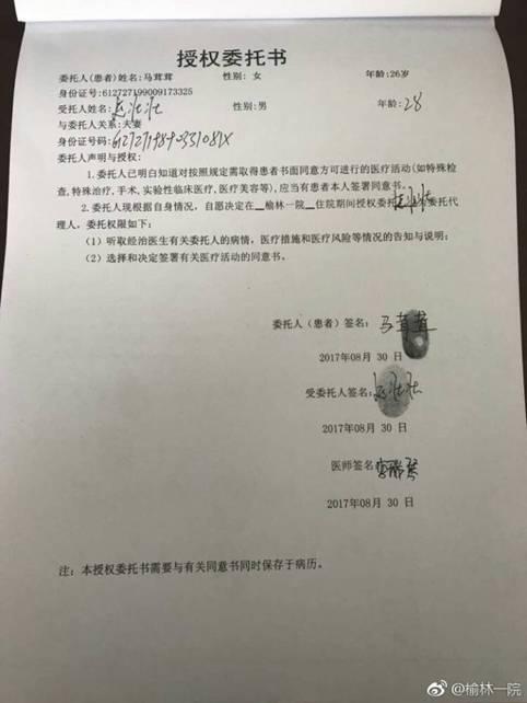 ▲產婦簽署了《授權書》,授權其丈夫全權負責簽署一切相關文書。圖據@榆林一院微博