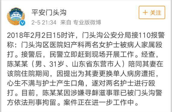 記者了解到,門頭溝公安分局已就此事進行通報,2018年2月2日15時許,門頭溝公安分局接110報警稱:門頭溝區醫院婦產科兩名女護士被病人家屬毆打。接警后,民警立即趕到現場開展工作。經查,陳某某(男,31歲,山東省東營市人)陪同其妻在該院住院期間,因提出為其妻更換單人病房遭拒,心生不滿與護士產生口角,遂對兩名護士進行毆打。目前,陳某某因涉嫌尋釁滋事罪已被門頭溝警方依法刑事拘留。案件正在進一步工作中。