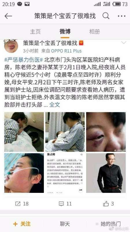 法制晚報·看法新聞記者看到多名自媒體網友轉發爆料稱,2018年2月2日15時許,北京市門頭溝區醫院婦產科,某公司流行聲樂講師陳占邦欲為凌晨4時順利分娩的妻子孫某某調整床位。陳與2名女家屬到護士站提出查看其他患者病歷,當班護士根據規定當即予以拒絕。