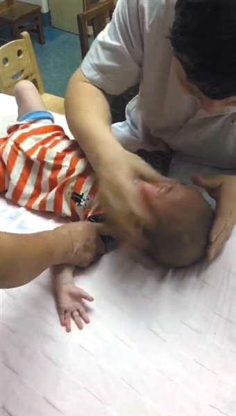 男子用右手托住孩童脖子,上下劇烈晃動(dòng)幾次,又把左手覆到孩子臉上,反復(fù)揉搓。大幅度“搖頭”中,孩子大哭不止。