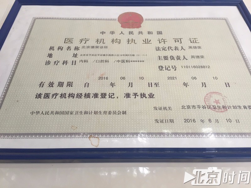 診所位于北京市平谷區平谷南街上,以他的名字命名,叫做北京德榮診所,其醫療機構執業許可證上所寫的經營項目為:內科/口腔科/中醫科。而實際上,門診是以牙科為主,所掛牌子也是德榮口腔診所。
