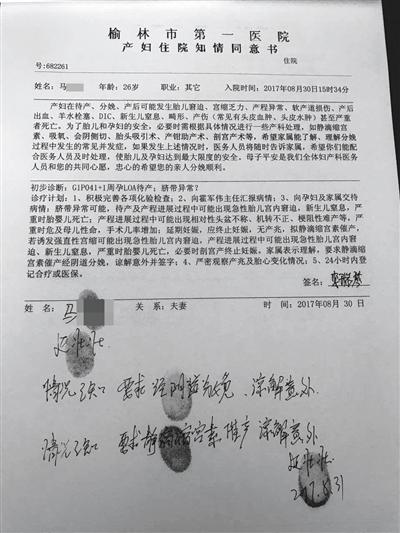 榆林市第一醫(yī)院提供的《產(chǎn)婦住院知情同意書》。