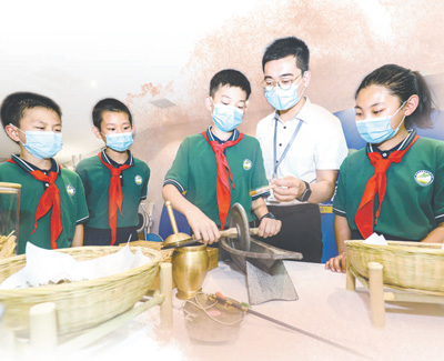 河北省石家莊市樂仁堂中醫藥健康科普館內,小學生在學習鐵藥碾使用方法。