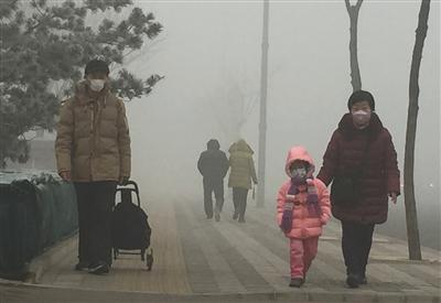2017年1月4日清晨,北京市大興區天宮院,行人戴著口罩在霧霾中行走。新京報記者尹亞飛攝