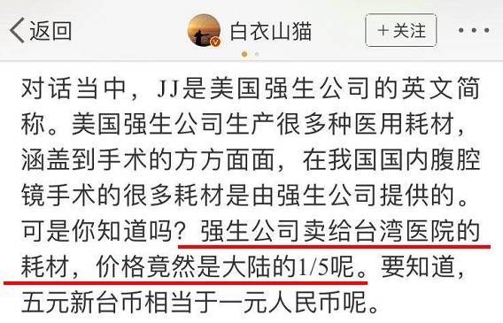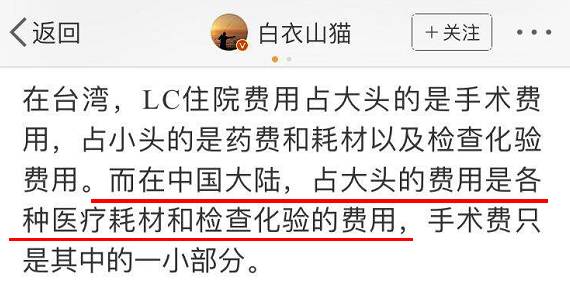 業(yè)內人士@白衣山貓發(fā)文稱,他從臺灣業(yè)內人士處得到的信息是,中國大陸的醫(yī)療耗材費用所占比例遠高于臺灣。