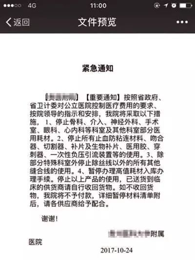 事情的起因是前幾天,落款為貴州省某三甲醫(yī)院的緊急通知被廣泛傳播。從內容中可以看出,醫(yī)院將采取停止多個科室部分醫(yī)用耗材的措施,還將暫停辦理高值耗材入庫手續(xù)。已經(jīng)送貨到臨床的供貨商被要求自行收回貨物。