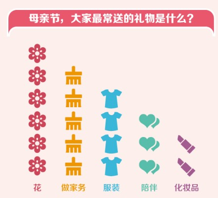 在排名前五的“禮物”中,除了有“花”、“服裝“、”化妝品”這類女性都很喜歡的東西外,還有“做家務(wù)”、“陪伴”這種關(guān)注媽媽“精神需要”的禮物。
