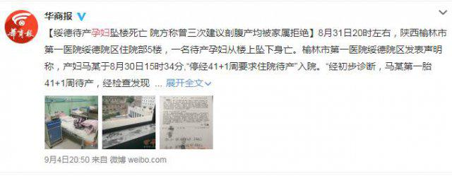 據媒體報道,榆林市第一醫院發表聲明稱是因為家屬多次拒絕實施剖腹產,最終導致產婦難忍疼痛、情緒失控跳樓。孕婦的丈夫延先生則否認了院方的說法,稱家屬曾先后兩次同意實施剖腹產,但醫院回說" 快要生了,不用剖腹產。"