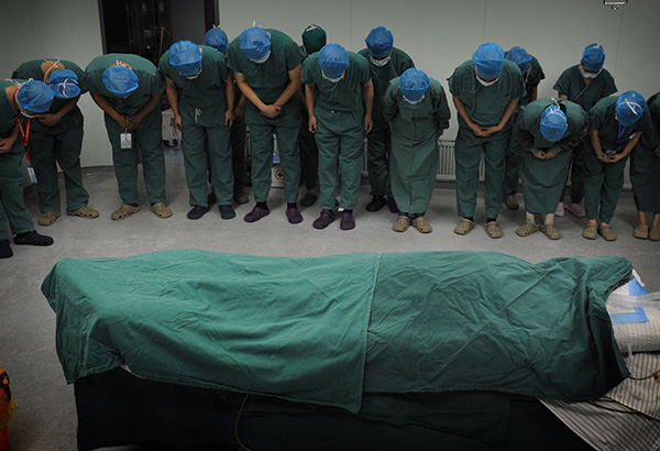 2016年9月29日,安徽省立醫院的手術室內,趙炬的器官捐贈手術在此進行。醫生們跟趙炬的遺體鞠躬告別。視覺中國資料圖