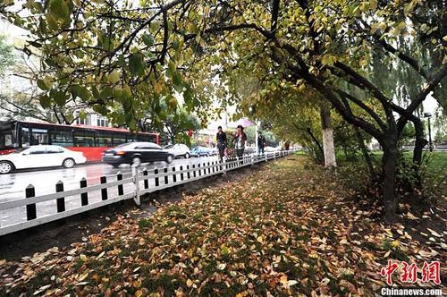 資料圖:二十四節氣中的寒露節氣,蘭州出現降雨降溫天氣,市民添衣防寒。楊艷敏攝