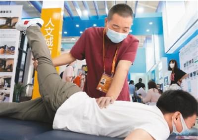 2021年9月3日,2021年中國國際服務貿易交易會上,參會者在文旅服務展館體驗正骨技法。