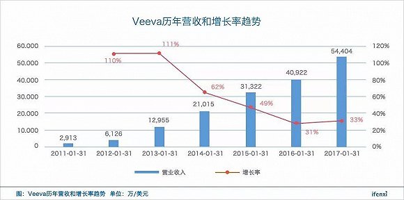 據(jù)Veeva最新財報顯示,2017財年前三季度營業(yè)收入5.01億美元,同比增長27.10%,預(yù)計2017整年營收增長率為27%,總體營收將達(dá)到6.91億美元。