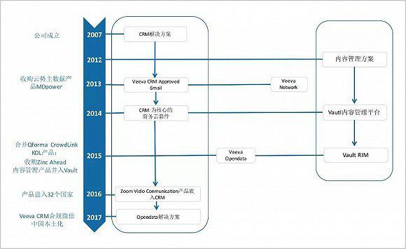Veeva以SaaS模式CRM起家,站穩(wěn)腳跟之后,進(jìn)行了產(chǎn)品和業(yè)務(wù)線擴(kuò)充,除了自研之外,也通過收購方式。Veeva初期的CRM解決方案取代的是Siebel Systems的產(chǎn)品,后者于2006年被Oracle收購,相關(guān)產(chǎn)品變?yōu)镺racle的產(chǎn)品線之一。