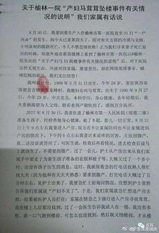 據華商報報道,8月31日20時左右,陜西榆林市第一醫院綏德院區住院部5樓,一名待產孕婦從樓上墜下身亡。報道顯示,產婦由于疼痛兩次走出分娩中心想剖腹產,但家屬堅持順產。醫院三次通知家屬均被拒絕。然而,在家屬公開的一封“聲明”信中,并不贊同醫院的說法。目前,雙方各執一詞。