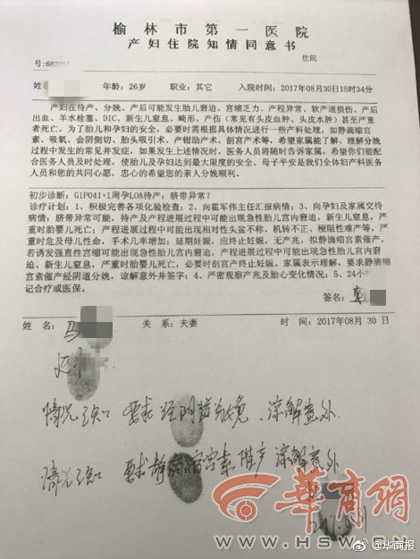 榆林市第一醫院綏德院區發表聲明稱,產婦馬某于8月30日15時34分,“停經41+1周要求住院待產”入院。“經初步診斷,馬某第一胎41+1周待產,經檢查發現胎兒頭部偏大,陰道分娩難產風險比較大。”綏德院區婦產科二病區主任霍軍偉接受華商報記者采訪時表示,檢查后醫護人員就向產婦、家屬說明情況,并建議剖宮產,然而家屬堅持順產,并在《產婦住院知情同意書》上簽字。