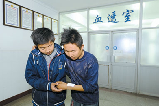 2011年4月,弟弟攙扶郜洪輝走出血透室。來源:《新安晚報》 作者:張洪金