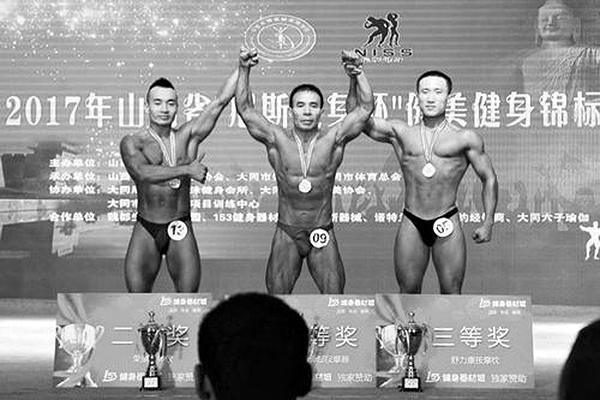 潘喜平(中)在2017年山西省健美健身錦標賽上獲得60公斤組冠軍,旁邊是與他最終PK的兩名二十多歲的選手。 山西晚報圖