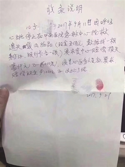 新京報記者獲得一份李平父親手寫的《收條說明》,其中稱,李平“于9月11日因呼吸心跳停止在中南醫院急救中心搶救,遺失袋內物品,要求貴中心賠償損失1000元,該中心醫務人員應要求,賠償現金1000元”。