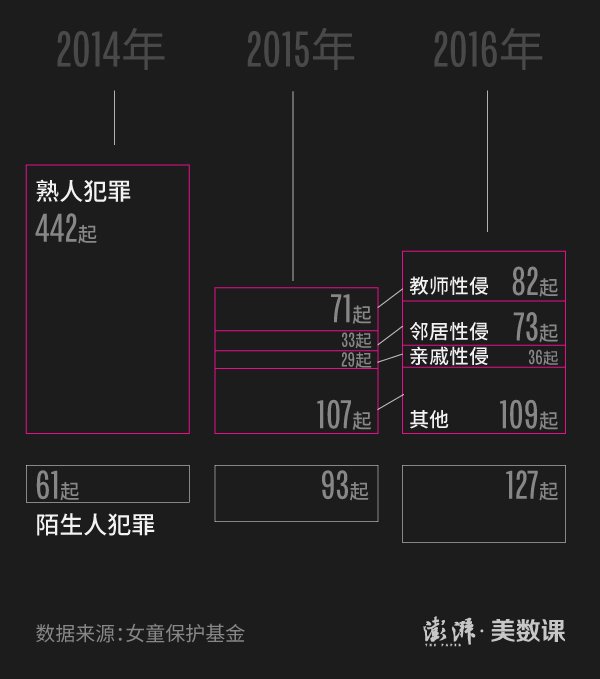近幾年,未成年人保護議題受到了公眾越來越多的關注。據女童保護基金的統計,媒體報道的性侵兒童(14歲以下男童女童)案件從2013年的125起上升到2016年的433起(受害人約778人)。現實生活中,案件數量遠高于媒體曝光起數:據最高人民法院6月1日新聞發布會,從2013年到2016年,僅猥褻兒童犯罪案件就已審結10782件。最高法正調研猥褻兒童情節惡劣的認定標準。