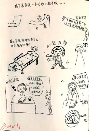 小劉上大學后喜歡看漫畫,有時會模仿別人畫的表情和動作,“沒事就愛亂畫,畫好了發在朋友圈里”。這次在南醫三院關節外科住院,她看到科室有一面貼感謝信的墻,上面貼著患者們感謝醫護人員的真誠話語。她想,有一天她的經歷也能寫上墻就好了,能給整個樓層的病友看,讓大家樂一樂。于是,便萌生了用漫畫作“感謝信”的想法。出院后的十天里,小劉每天畫一點,住院期間護士們的耐心、醫生術前談話的嚴謹、術前禁食的無奈、術中慢慢放松的心情、術后第一天醫生就讓其下地康復的嚴厲、病友之間的融洽……都被她一筆一畫畫進了漫畫,“我從來沒正規學過畫畫,也沒有打草稿的習慣,有時候不知道某個表情怎么畫,就到微博上參考一下別人的畫法。”十天后,她趁回醫院拆線的機會,把這組漫畫送給醫生。小劉的主刀醫生、南醫三院關節外科、運動醫學科副主任曾春說:“這是我收到過的最好的禮物。”