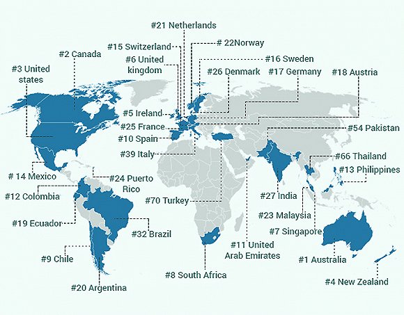 按照以上條件得出的研究結(jié)果如下圖。可以看到,對健康觀念最有興趣的前10個國家是:澳大利亞、加拿大、美國、新西蘭、愛爾蘭、英國、新加坡、南非、智利、西班牙。對健康觀念興趣最低的10個國家則包括(排名從后往前):尼泊爾、孟加拉國、巴林、敘利亞、波黑、阿曼、斯里蘭卡、卡塔爾、突尼斯、伊拉克。