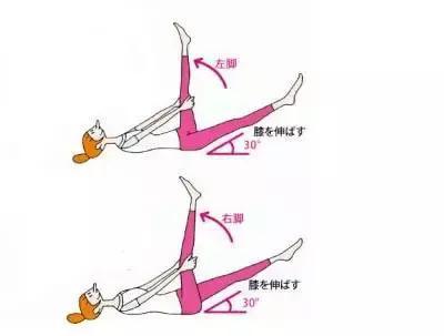 平躺,右腳舉成90度,左腳保持30度的姿勢。雙手要抱住90度的腳,手腳伸直,背部也要伸直,一個動作維持30秒,然后換過來再做一遍。可以訓練到腹部的肌肉,大腿的肌肉也能得到很好的伸展。