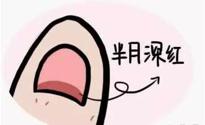 指甲上的半月深紅是心臟病的征兆,如果淡紅色多是貧血導致的。此時要去醫院確診,在食譜中增加含鐵的食物,如大豆、牛肉、菠菜、葡萄干等可預防貧血。