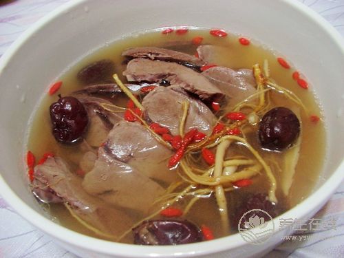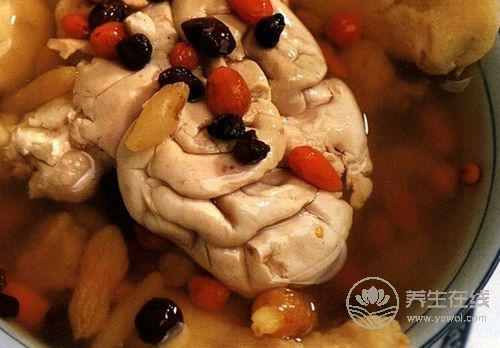 材料:豬腦2個,人參、五味子各6克,麥冬、枸杞子各15克,生姜4片,食鹽少許。