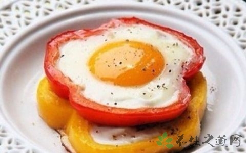 ?做法:紅黃彩椒各一個,雞蛋2-3個;彩椒洗凈去蒂,切成厚度均勻的彩椒圈;平底鍋加熱倒油,抹勻鍋底,下入彩椒圈;將雞蛋分別打入彩椒圈中,中小火煎制;待雞蛋凝固,撒適量鹽、黑胡椒調味即可。