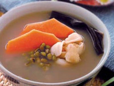 海蛤30克,墨魚6條,熟地10克,黨參2只,生姜20克。做法:將海蛤、墨魚洗凈,墨魚切段,生姜拍一拍,與其余的配料一同放入無油的瓦罐中,加清水浸沒原料,火慢燉2小時(shí),起鍋時(shí)加入3克食鹽。切忌加鹽過多,因?yàn)檫^咸會(huì)傷腎。功效:這道湯羹以海蛤、墨魚等咸寒之物補(bǔ)益腎陰,配合生姜除寒,黨參益氣生津。