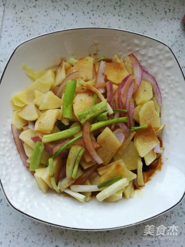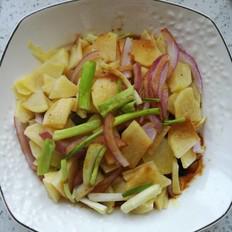 2.把土豆切片,洋蔥節條,小蔥切段,依次放上孜然粉,鹽,醬油,香油。