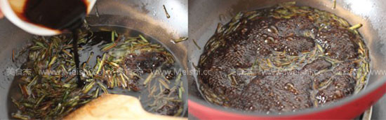 5.隨即倒入生抽、老抽,轉大火至沸騰狀,關火,蔥油汁就熬好了