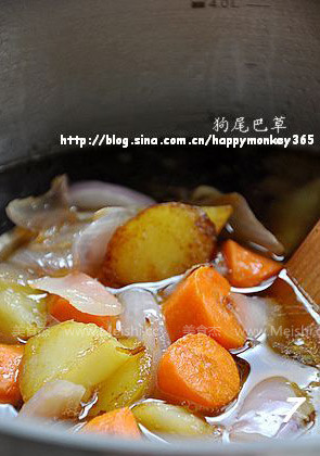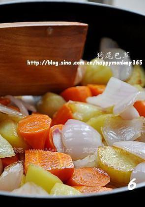 6.另起一炒鍋,倒少許油,將胡蘿卜塊、土豆塊、洋蔥下入鍋中,加適量鹽,翻炒5分鐘左右。這樣炒過之后,蔬菜更易熟,更進味兒