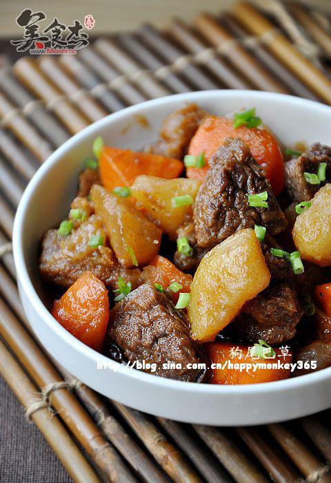 7.此時鍋里的湯也收了一小部分了,下入步驟6中炒過的蔬菜,繼續燉煮,要時不時攪一攪,防止粘鍋,喜歡湯汁拌飯的,最后汁不要收得太干,可以稍稍留一點。起鍋之前,磨點黑胡椒粉撒上。撒點蔥花裝飾一下也行