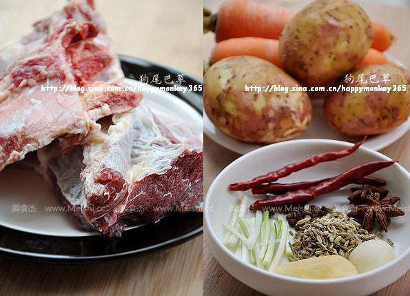 1.牛肉切塊,和蔥段一起下入涼水鍋中,焯水。(水開后繼續煮兩三分鐘即可,看見血沫都吐出來就行)牛肉撈出來沖干凈,瀝干備用。等待水開的時候,我們可以處理蔬菜了,土豆胡蘿卜切滾刀塊,洋蔥切片,姜蒜切片