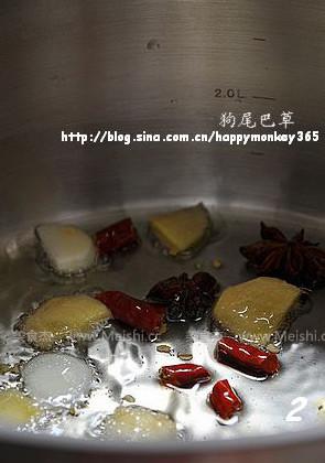 2.鍋洗凈,倒適量油,油熱后下入姜片,蒜片,八角,干紅椒段爆香