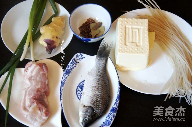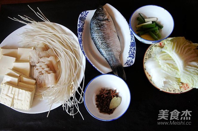 3.粉條提前冷水浸泡,蔥姜洗凈切段切片,魚去鱗去內臟去腮,洗凈去醒線打花刀,白菜洗凈切段,豆腐切片,五花肉切片