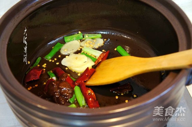 5.砂鍋加入適量的油炸香花椒大料,基本炸糊,然后取出花椒大料扔掉