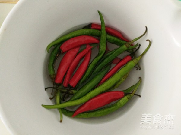 1.青紅辣椒用鹽水浸泡5分鐘后洗凈。