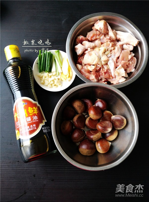 1.備好食材:雞肉,板栗,姜片,蔥段,蒜粒,六月鮮紅燒醬油;