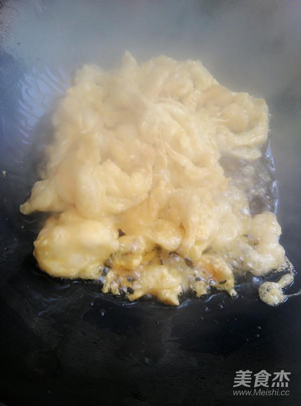 熱鍋倒油燒開,倒入雞蛋液劃散,盛出